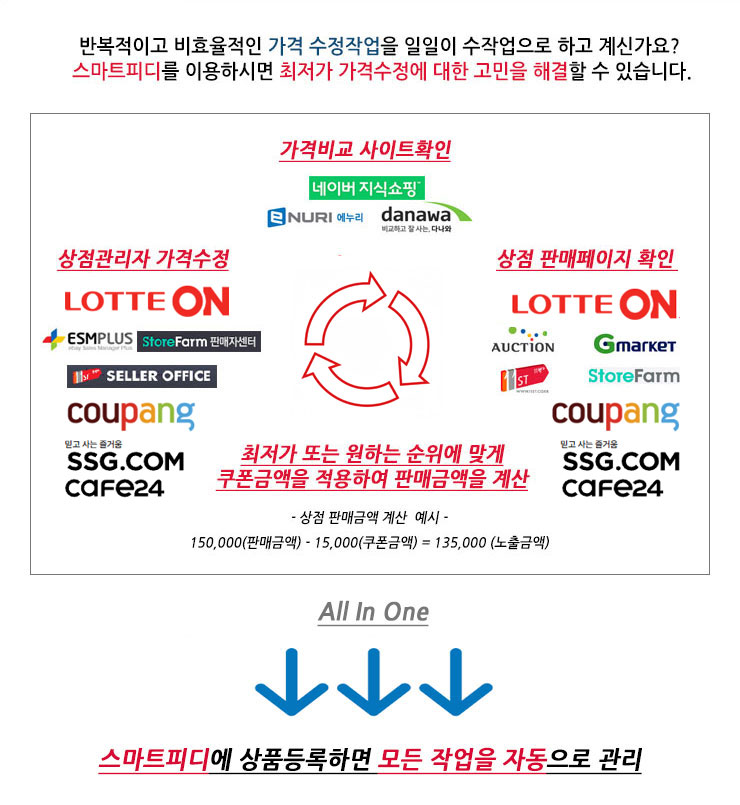 스마트피디 소개 - 반복적이고 비효율적인 가격수정 작업을 일일이 수작업으로 하고 계신가요? 스마트피디를 이용하시면 최저가 가격수정에 대한 고민을 해결할 수 있습니다.