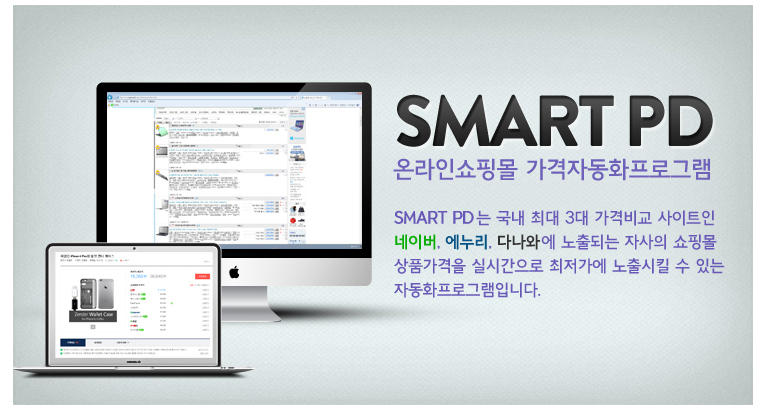 스마트PD 소프트웨어는 가격비교 사이트 네이버, 에누리, 다나와 등 한번에 관리할 수 있는 자동화 소프트웨어로 한곳에 노출하시는 것보다 3사의 가격비교사이트를 전부 관리할 수 있으므로 저비용 고효율로 많은 매출증대에 도움을 드릴 것을 약속합니다.
